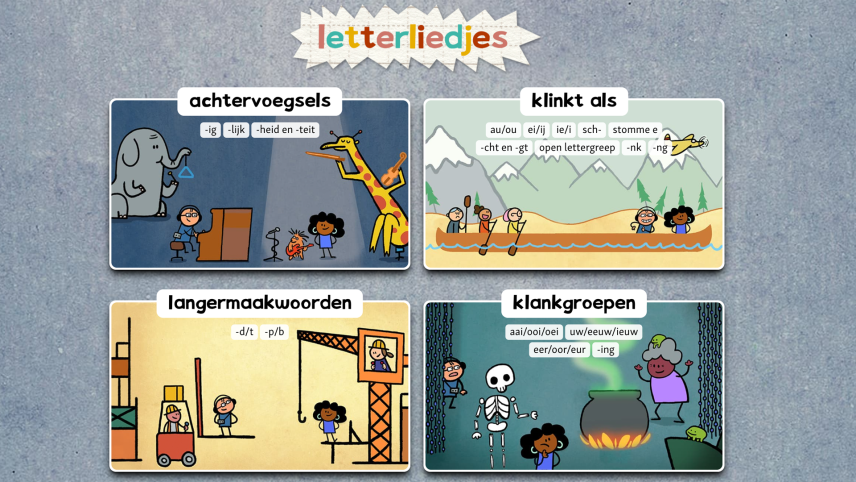 In het Letterliedjes oefenspel kun je samen met je klas aan de slag met alle klanken uit onze Letterliedjes. Is het nou schattug of schattig? En schrijf je pauw of pouw? Kies een van de vier categorieën en oefen zoveel woordjes als je wil. Klik op de afbeelding om het spel te openen.